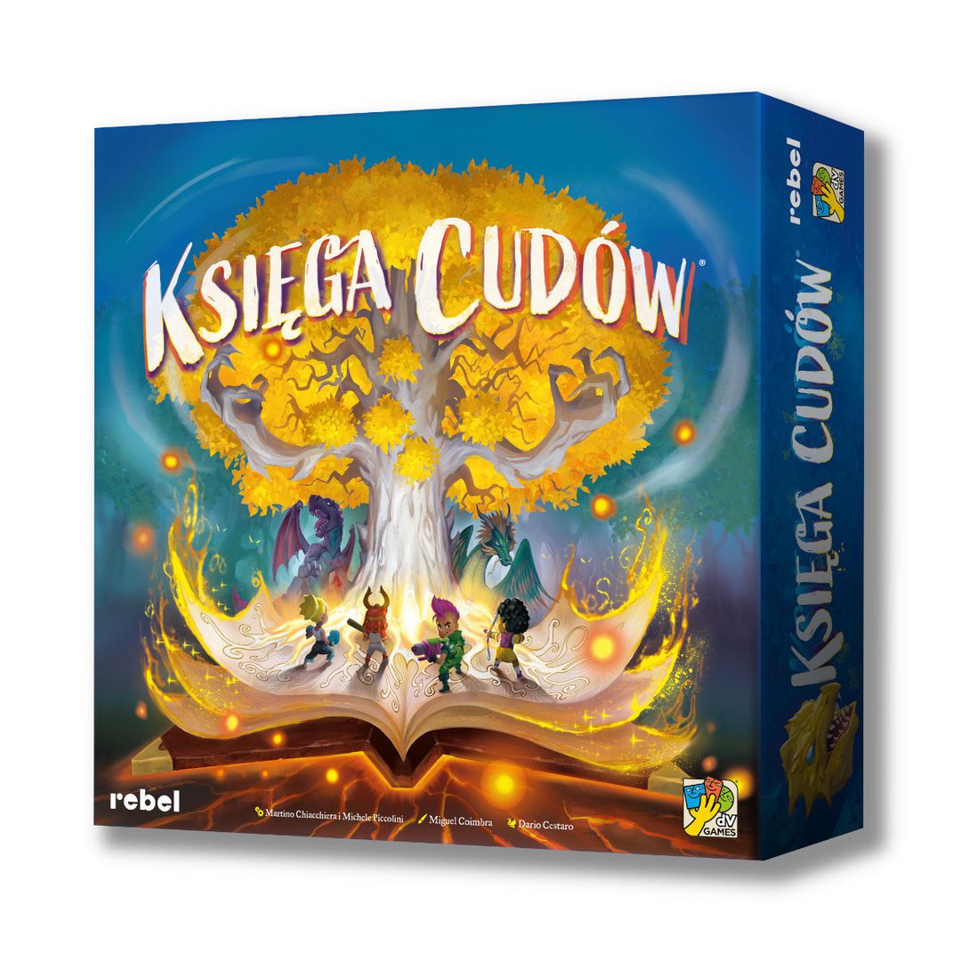 Księga cudów / twórcy Martino Chacchiera, Michelle Piccolini ; ilustracje Miguel Coimbra. - Gdańska : REBEL, copyright 2021. - 1 pudełko zawiera: rozkładana książka, 4 figurki bohaterów, 8 figurek zębaczy, 248 kart (6 talii rozdziałów), 6 kart zębaczy, 16 kart skrawków, 5 kości, 17 znaczników iskier magii, 40 żetonów serc, 10 żetonów przeznaczenia, 8 żetonów oszołomienia, żeton mrocznej aury, 4 pierścienie do podstawek, koperta skrzyni + instrukcja