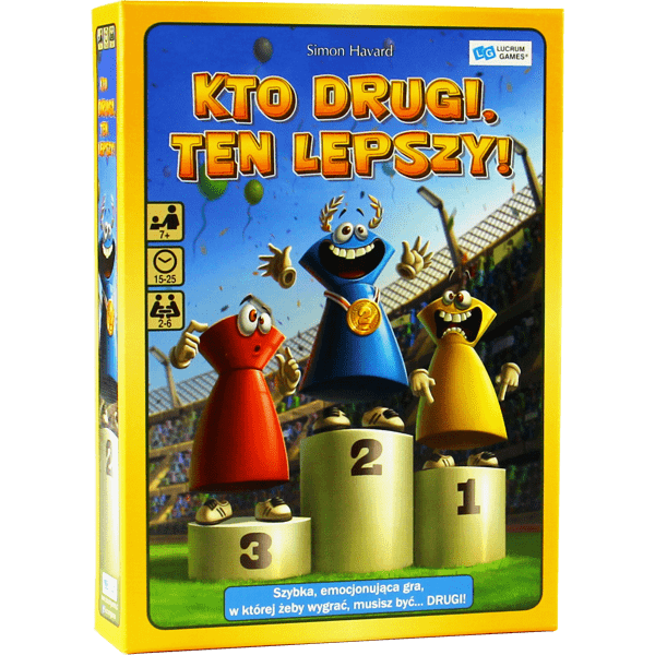 Streszczenie: Szybka, emocjonująca i bardzo śmieszna gra, w której cały czas próbujesz być na drugim miejscu. W każdej z 5 tur punktuje gracz, który jest drugi. Na koniec sumujecie wszystkie punkty. Wygrywa oczywiście drugi! Przeznaczona dla 2-6 graczy powyżej 7 roku życia. Czas trwania 15-25 min.