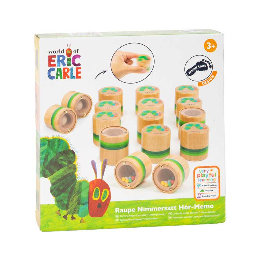 Raupe Nimmersatt : Hőr-Memo. - Delmenhorst : Legler OHG small foot company, 2019. - 1 gra (16 pojemniczków wypełnionych różnymi drobinami) : tektura, karton, drewno, plastik, kolor ; w pudełku 5x17x17 cm.