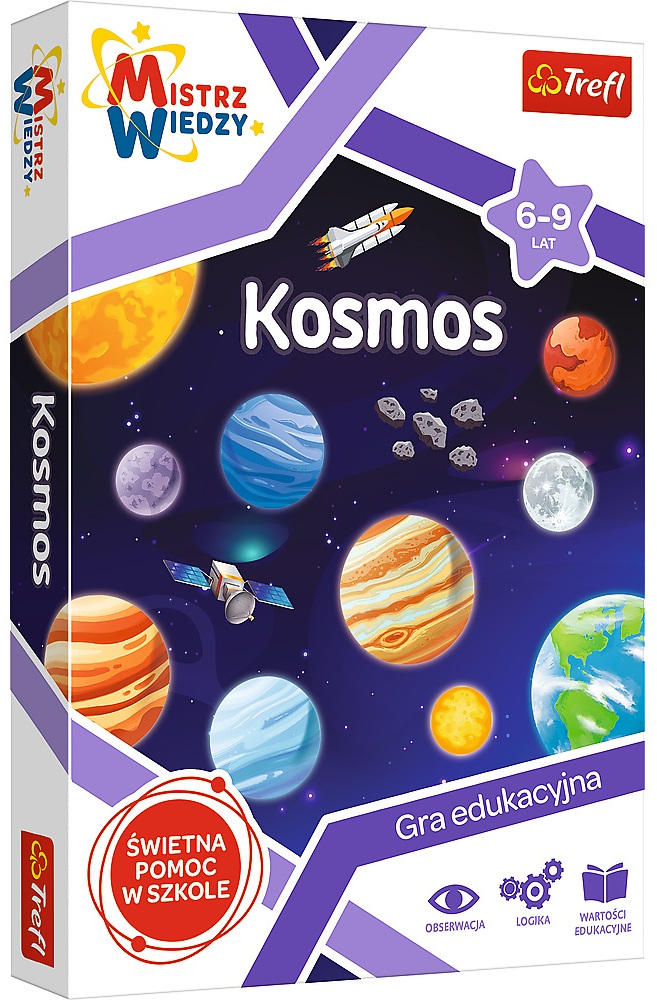 Pięknie ilustrowana plansza, barwne pionki i żetony to doskonałe zaproszenie do świata nauki, poprzez świetną zabawę! Wszechświat nie ma żadnych granic, a możliwości wykorzystania gry nie znają żadnych ograniczeń! To połączenie quizu, gry planszowej, układanki i memos [https://www.empik.com/trefl-gra-edukacyjna-kosmos-mistrz-wiedzy-trefl,p1246841329,zabawki-p#ProductDescription]