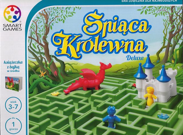 Śpiąca Królewna : deluxe / concept, game design and artwork: SMART - Belgium ; designer: Raf Peeters. - Kraków : Wydawnictwo IUVI, © 2017. - 1 gra (4 fragmenty labiryntu, figurka królewny, figurka rycerza, smok, zamek) : tektura, karton, plastik, kolor ; w pudełku 29x29x8 cm + instrukcja ([1] strona ; 12 cm) + książeczka z 60 zadaniami, książeczka z bajką, zasady gry.