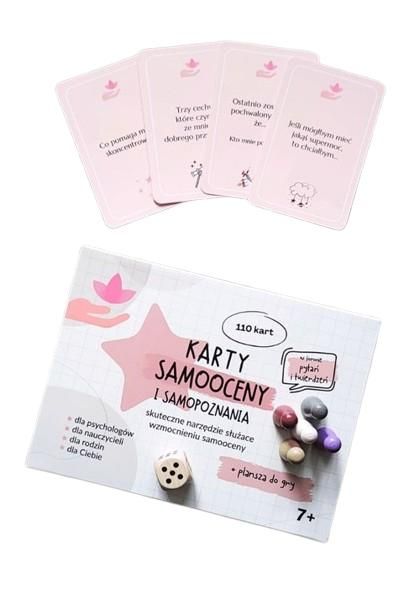 Karty samooceny i samopoznania : skuteczne narzędzie służące wzmocnieniu samooceny / Michalina Płotka. - Warszawa : psychologiadziecka.org, copyright 2024. - 1 gra (1 plansza, 110 kart podzielonych na moduły, 2 znaczniki w kształcie gwiazdki, 5 różnokolorowych pionków, 1 kostka) ; 16x12x4 cm + instrukcja ([8] stron : ilustracje ; 20 cm).