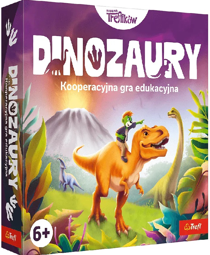 Dinozaury : kooperacyjna gra edukacyjna / [autor gry: Monika Rutkowska-Leśniewska ; ilustracje: Vladoslava Vinichenko]. - Gdynia : Trefl, [2026]. - 1 gra (drewniany pionek dinozaury, kostka, licznik lawy, 45 kart quizowych, 10 kart specjalnych, plansza z 10 wyjmowanymi elementami-przeszkodami) : karton, plastik, tektura, kolor ; w pudełku 6x25x25 cm + instrukcja (7, [1] strona : ilustracje ; 21 cm).