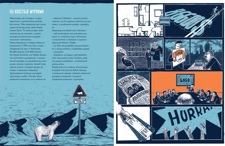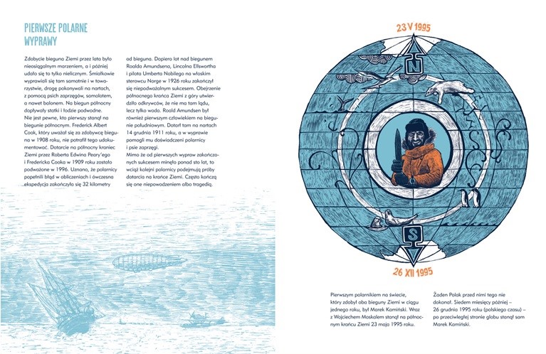 Czy łatwiej jest przejść na nartach Ocean Arktyczny, czy może Antarktydę, najzimniejszy kontynent świata? Dlaczego przed wyprawą warto trenować pływanie w nartach i kurtce, spać w ogródku w namiocie i biegać po lesie, ciągnąc za sobą opony? Co spakować na sanie, a z czego zrezygnować? Jak przechodzić szczeliny, wspinać na torosy i skakać z kry na krę? Jak odróżnić biegun magnetyczny od geograficznego i jak się nie zgubić w gęstej mgle? Książka graficzna „Marek Kamiński. Jak zdobyć bieguny Ziemi. W rok” opowiada o wyczynie polskiego polarnika, który w maju 1995 roku wraz z Wojciechem Moskalem jako pierwszy Polak zdobył północny kraniec Ziemi, a siedem miesięcy później dotarł samotnie na biegun południowy. Tym samym został pierwszym człowiekiem na świecie, który w jednym roku zdobył oba bieguny.