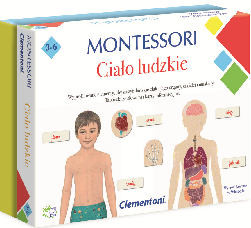 Montessori : ciało ludzkie / [projekt i opracowanie: Loretta Cordoni, Annarita Valeri, Andrea Cozzoni we współpracy z nauczycielami Montessori]. - [Gdańsk] : Clementoni Polska, 2019. - 1 pudełko (1 karta złożona, 8 tablic edukacyjnych z puzzlami, 4 karty informacyjne, 30 fiszek) : ilustracje ; 20x24 cm.+1 książka
