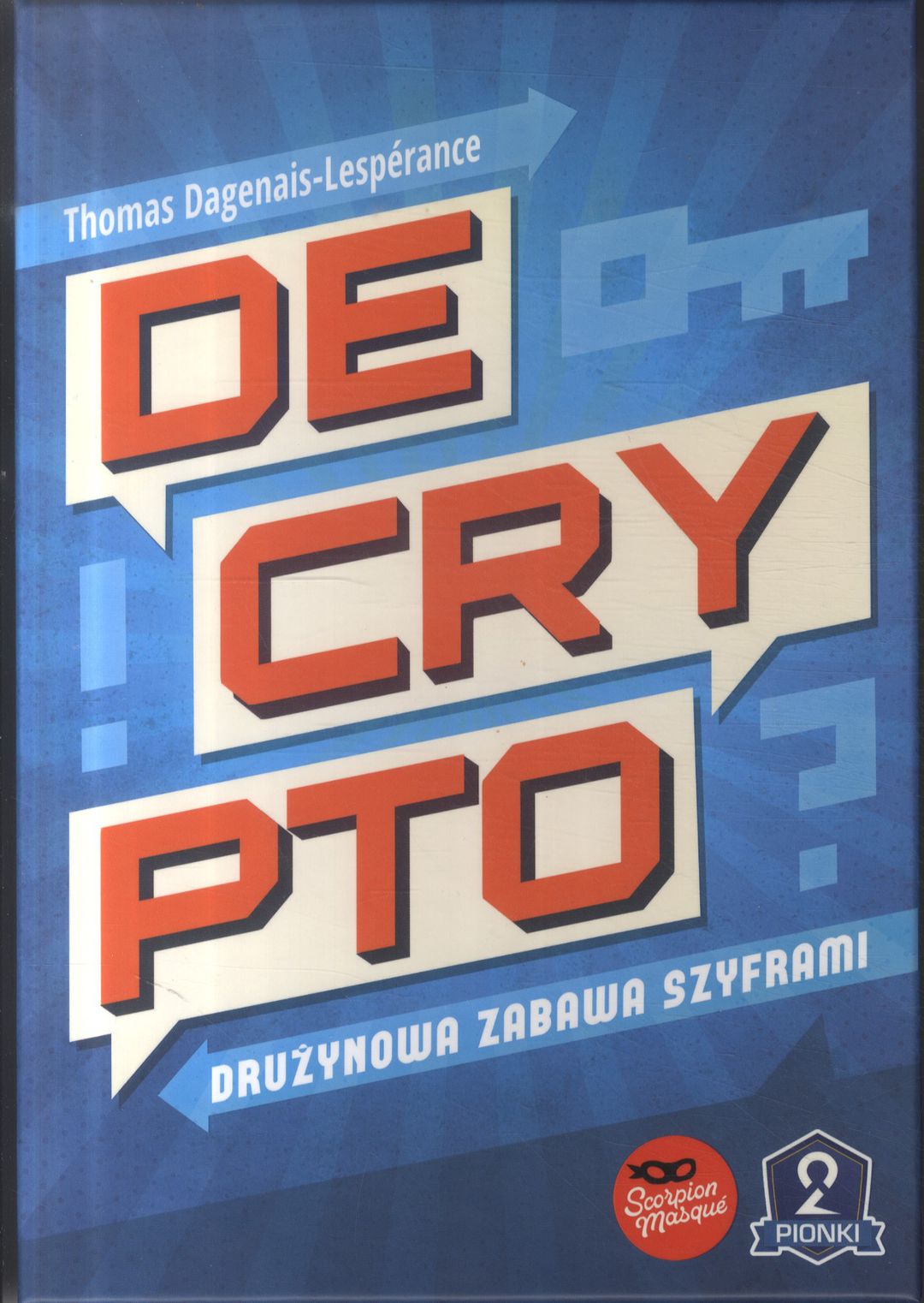 Decrypto : drużynowa zabawa szyframi / Thomas Dagenais-Lespérance ; ilustracje: NILS, Fabien Fulchiron, Manuel Sanchez. - Gliwice : Portal Games, © 2018. - 1 gra ( 2 zasłonki na hasła, 48 kart kodów, 110 kart słów kluczy, 8 żetonów, 50 kart do notowania, 1 klepsydra) : plastik, tektura, papier, kolor ; w pudełku 23x16x5 cm + instrukcja (11, [1] strona : ilustracje ; 20 cm).