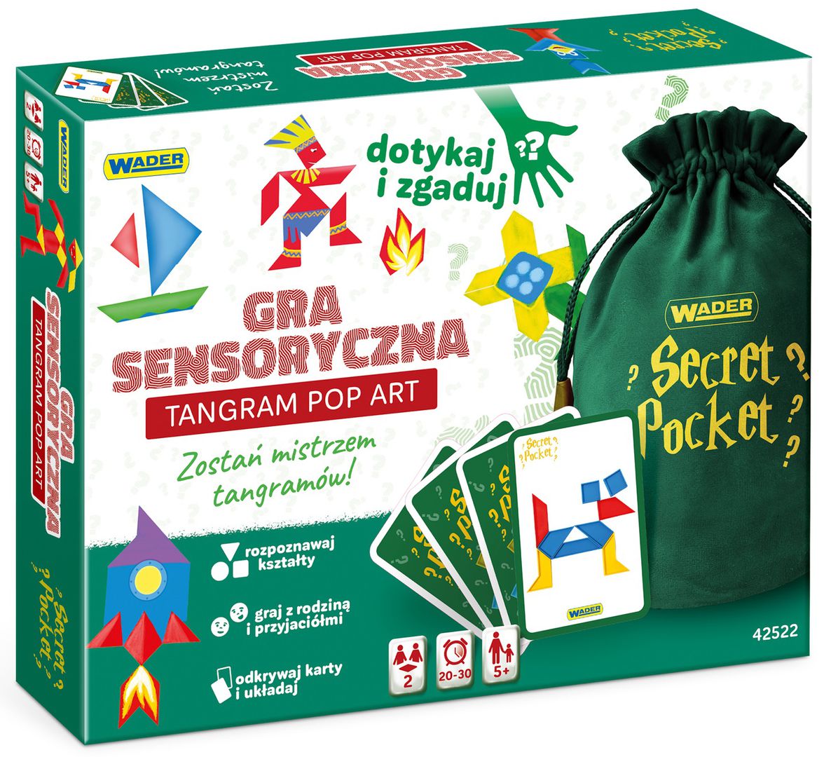 Gry sensoryczne Secret Pocket od Wader-Woźniak, odkryją przed dziećmi bogaty świat zmysłów. Gry sensoryczne czyli takie, które oddziałują na dotyk, wzrok lub słuch dzieci i stymulują ich rozwój fizyczny i umysłowy. Zaletą gier sensorycznych od Wader jest ich prostota, ciekawy koncept, wysoka jakość poszczególnych elementów zabawki oraz atrakcyjna szata graficzna.