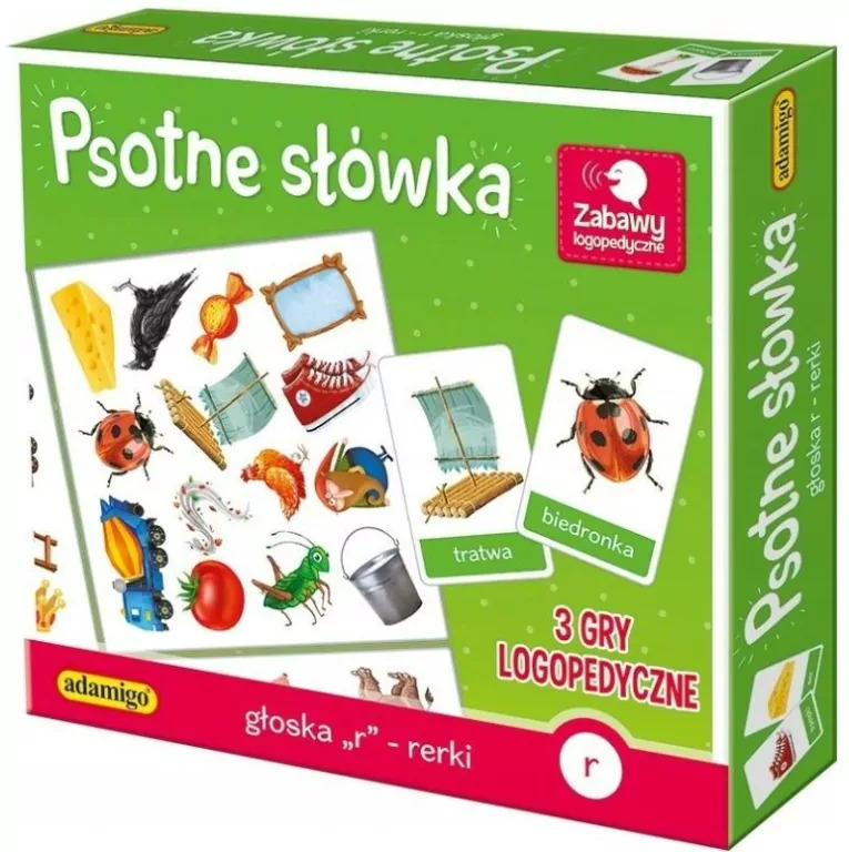 Psotne słówka : głoska "r" - rerki / pomysł i zasady gry: Magdalena Kuczyńska ; ilustracje: Maja Barska. - Czestochowa : Adamingo, 2019. - 1 gra (4 dwustronne plansze, 36 tafelków, 56 kart ) : tektura, karton, kolor ; w pudełku 5x22x24 cm + instrukcja ([4] strony : ilustracje ; 21 cm).