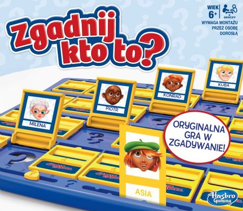 Zgadnij kto to? - Warszawa : Hasbro Poland, copyright 2017. - 1 gra (2 plansze, 48 kart postaci, 24 tajemnicze karty, 2 znaczniki punktacji) : plastik, tektura, kolor ; w pudełku 5x31x27 cm + instrukcja ([2] strony : ilustracje ; 23 cm).