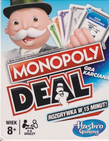 GRA PLANSZOWA. Witaj w świecie Monopoly Deal, gdzie reguły znane z oryginalnej gry Monopoly połączono z dynamiką gry w karty. Nowy wygląd oraz skondensowane zasady gry pozwolą wam rozegrać partię Monopoly Deal nawet w 15 minut. Zbieraj karty Własności, korzystaj z kart Akcji, aby zmusić pozostałych graczy do spłaty czynszu i dobijaj targu. Gracz, który jako pierwszy zbierze 3 pełne Zestawy Nieruchomości w różnych kolorach - wygrywa.
